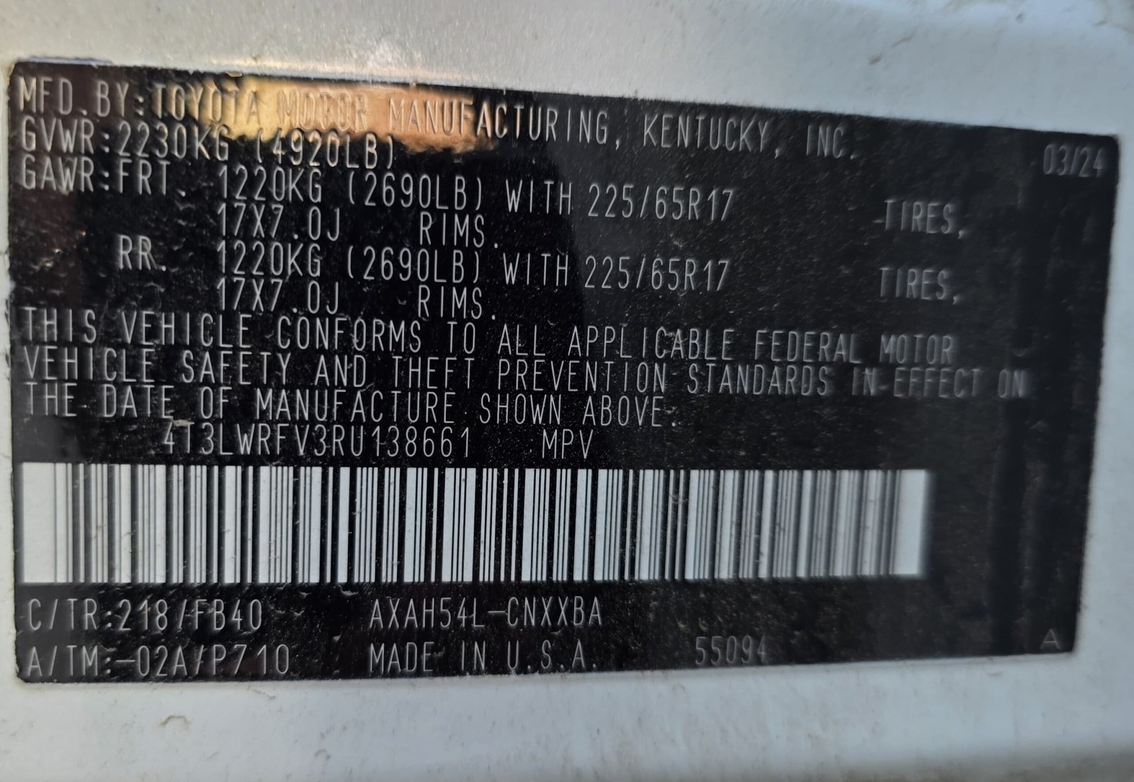 | VIN | 4T3LWRFV3RU138661 |